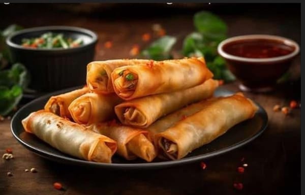 Hausgemachte Reisrollen knusprig gebacken und gefüllt mit Hackfleisch, Ei, Morcheln. Glasnudeln und Gemüse serviert mit Salatgarnitur und Chili-Limetten-Ingwer Dip