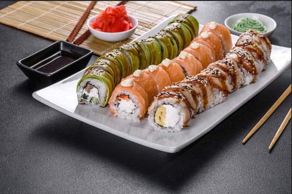 Krebs, Ebi, Aal, Philadelphia, Gurken, Mango, Avocado ummantelt mit, Feuerlachs und Feuerthunfisch
